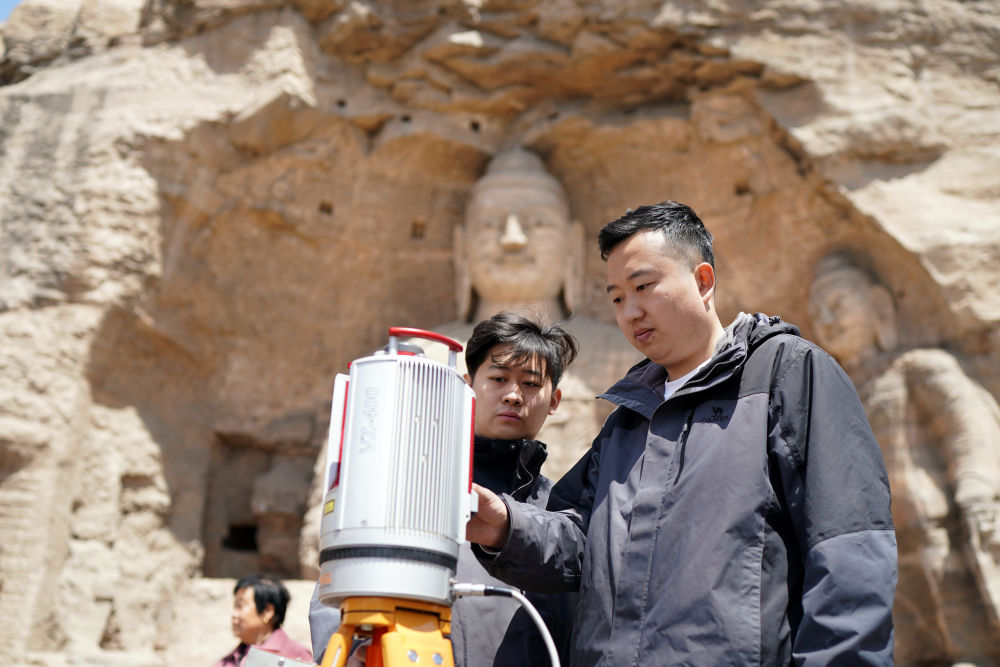 云岡研究院數(shù)字化保護中心工作人員在進行數(shù)據采集(2021年5月8日攝)。