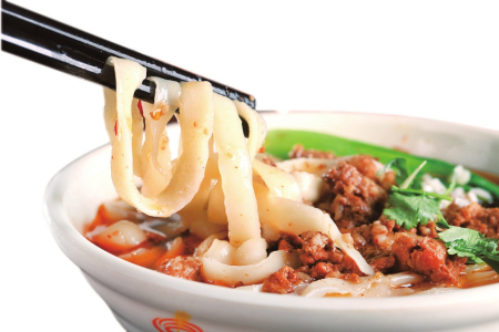 在開始削面之前,非常重要的步驟就是和面和醒面。和面的面和水需要按照一定的比例,同時對水溫也有一定的要求,冬天要用熱水,夏天要用涼水,春秋要用溫水。和好面之后緊接著就是醒面,需要用濕布蓋住面團醒20分鐘左右。如果說吃刀削面是飽了口福,那么看刀削面下鍋可稱之為飽了眼福。一只手托著放著面團的案板,另一只手拿著削面刀,削面刀又分為片刀和勾刀,削面時,出力要平,用力要均,削出的面條中間厚兩邊薄,一葉連著一葉,在空中劃出一道道弧形白線,落入鍋中的面條好似一條條銀魚,隨著熱水的翻滾不斷舞動。有順口溜贊曰:“一葉落鍋一葉飄,一葉離面又出刀,銀魚落水翻白浪,柳葉乘風下樹梢?!?/p>
