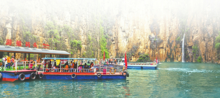 伴隨著他的講解,穿過800米的“時空隧道”,八泉峽山清水秀的核心地帶就躍然眼前了。3000米長的游船觀光水路時寬時窄,順流而下,游船上靜聽水流鳥鳴,看水中游魚穿梭而過,高峽平湖間,隨手一拍即是如畫美景,或碧波蕩漾,或山崖高聳,平靜的湖面與對峙的高山形成鮮明對比,不負“抬頭張家界,低頭九寨溝”之美名。