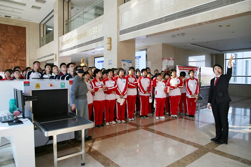 “同學們,這邊是我們的安檢通道,進入法院的人員需要在這里接受安全檢查,所有違禁物品是不能進入法院的?!痹诜ㄔ褐v解員的帶領(lǐng)下,同學們先后參觀了訴訟服務(wù)中心、陽光大廳、審判法庭、法治宣傳教育室、院史陳列室等場所,認真觀看了中院全面建設(shè)專題片和中院干警自編自導自演的預防未成年人犯罪題材法治微電影《你依然是天使》,全面了解了法院的職能作用、機構(gòu)設(shè)置、辦案流程和歷史文化等情況。