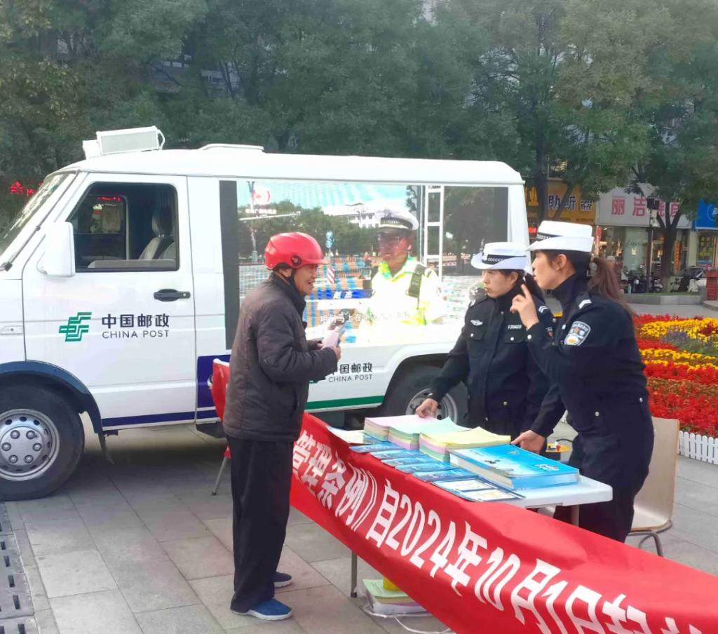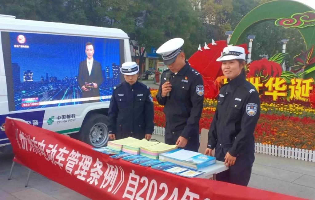 在人頭攢動(dòng)的廣場(chǎng)上,“一盔一帶”宣傳展板、警郵直播車(chē)大屏幕吸引了過(guò)往群眾駐足觀(guān)看?!按髬?zhuān)滦抻喌摹缎弥菔须妱?dòng)車(chē)管理?xiàng)l例》已于本月1日起開(kāi)始施行,您知道嗎?”“大叔,您這舊的電動(dòng)自行車(chē)要抓緊時(shí)間登記備案、辦理臨時(shí)牌照,咱忻府區(qū)24個(gè)警郵合作電動(dòng)自行車(chē)便民登記服務(wù)網(wǎng)點(diǎn)都能辦理過(guò)渡期臨牌”“騎乘電動(dòng)自行車(chē)必須要佩戴安全頭盔,不能闖紅燈、逆行......”